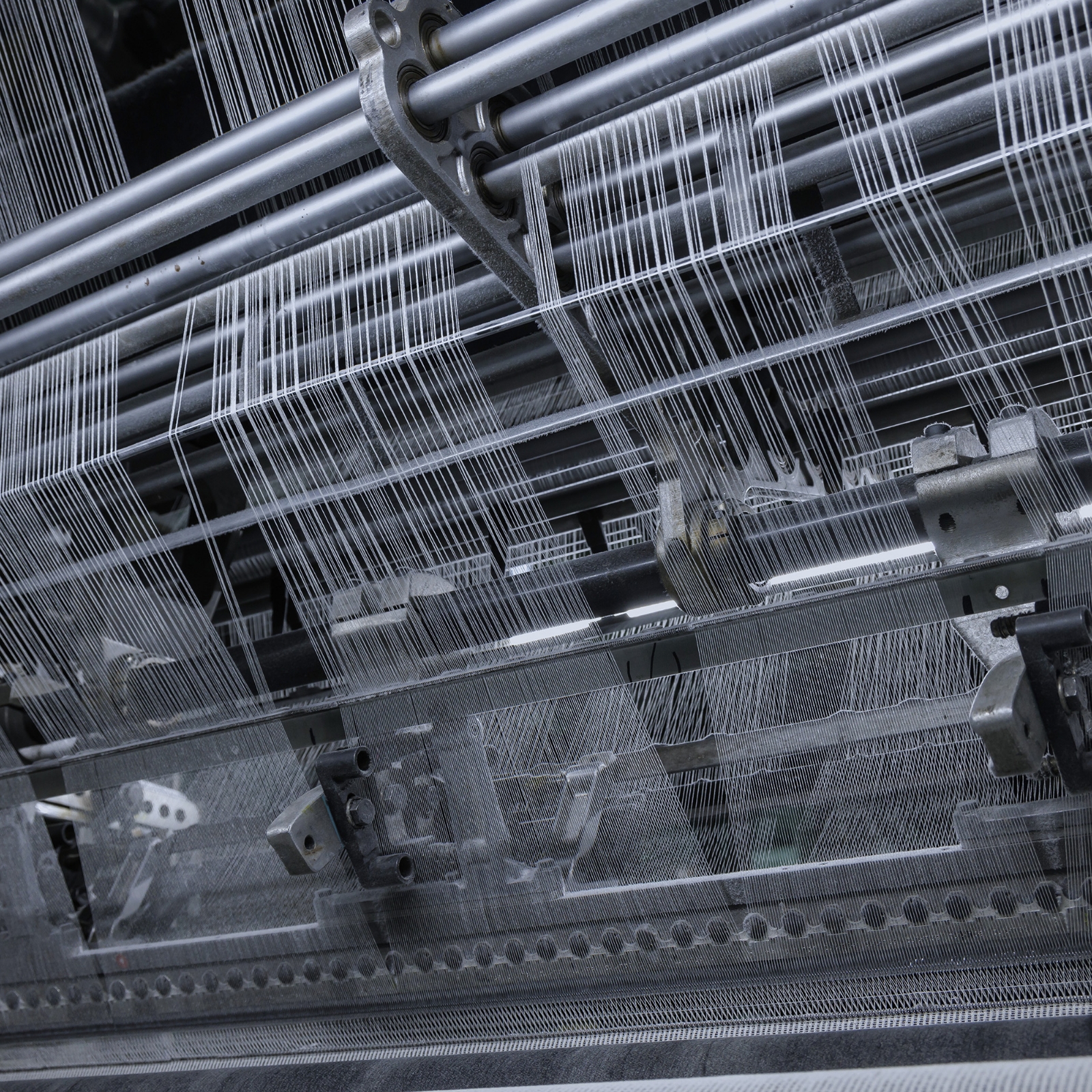 編物は、糸のループを立体的に組み上げることで布を形づくる技術です。織物が格子状の平面構造であるのに対し、編物は前後左右に動く筬(おさ)を用いて空中で糸を編み上げるため、柔らかさと奥行き、豊かな表情が生まれます。鮎川工場では、約50年前から稼働する「10号機」が78枚の筬を巧みに操り、高度な装飾性を創出。その潜在力は、熟練の職人たちの手によって最大限に引き出されています。